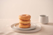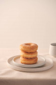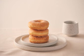 Zdjęcie "Świeże pączki z cukrem w proszku i kawy z mlekiem na drewnianym stole. Śniadanie w wiosce. " może być wykorzystywane do celów osobistych i komercyjnych zgodnie z warunkami zakupionej licencji Royalty-free. Obraz jest dostępny do pobrania w jakości wysokiej rozdzielczości do 5760x3840.