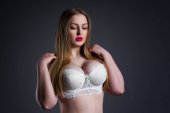 Sexy plus rozmiar modelu w czarny gorset, Gruba kobieta z dużym biustem naturalne na ciemnym tle, pozytywne pojęcie ciała