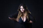 Sexy plus rozmiar modelu w czarny gorset, Gruba kobieta z dużym biustem naturalne na ciemnym tle, pozytywne pojęcie ciała