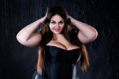 Sexy plus rozmiar modelu w czarny gorset, Gruba kobieta z dużym biustem naturalne na ciemnym tle, pozytywne pojęcie ciała