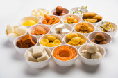 Rangoli z różnych indyjskich słodyczy/Mithai w misce dla Diziego lub innych festiwalach, selektywne skupienie