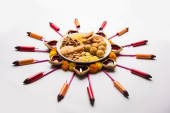 Rangoli z różnych indyjskich słodyczy/Mithai w misce dla Diziego lub innych festiwalach, selektywne skupienie