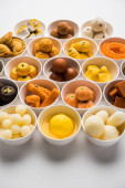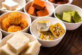Rangoli z różnych indyjskich słodyczy/Mithai w misce dla Diziego lub innych festiwalach, selektywne skupienie