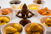 Rangoli z różnych indyjskich słodyczy/Mithai w misce dla Diziego lub innych festiwalach, selektywne skupienie