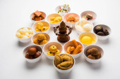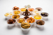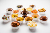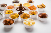 Rangoli z różnych indyjskich słodyczy/Mithai w misce dla Diziego lub innych festiwalach, selektywne skupienie