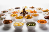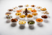 Flower Rangoli z słodyczami/Mithai i Diya w misy dla Diziego lub innych festiwalach w Indiach, selektywne skupienie