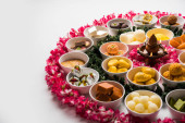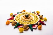 Flower Rangoli z słodyczami/Mithai i Diya w misy dla Diziego lub innych festiwalach w Indiach, selektywne skupienie