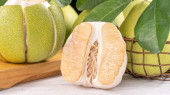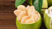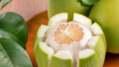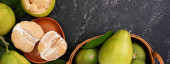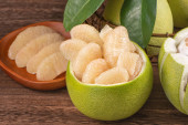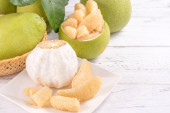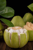 Świeżo obrane pomelo, grejpfrut, shaddock z zielonymi liśćmi na ciemnym drewnianym stole do desek. Sezonowe owoce w pobliżu połowy jesieni festiwalu, zbliżenie, Kopiuj przestrzeń