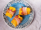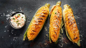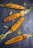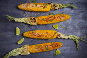 Widok z góry grillowanego COB kukurydzy z parmezanem, papryka, sól, kolendry i wapna