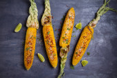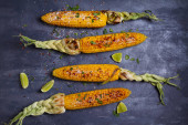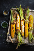 Widok z grilla z grillowanym COB kukurydzy z parmezanem, papryka, sól, kolendry i wapna. Kopiuj przestrzeń