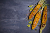 Zdjęcie "Widok z grilla z grillowanym COB kukurydzy z parmezanem, papryka, sól, kolendry i wapna. Kopiuj przestrzeń" może być wykorzystywane do celów osobistych i komercyjnych zgodnie z warunkami zakupionej licencji Royalty-free. Obraz jest dostępny do pobrania w jakości wysokiej rozdzielczości do 5760x3840.