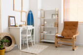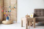 Miękkie krzesło z gałązami eukaliptusa i płonące świece we wnętrzu pomieszczenia