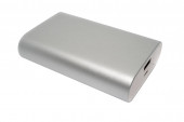 Widok zbliżenie prostokątny srebrny Bank mocy izolowane na białym tle. Ładowarka do telefonów komórkowych, laptopów i innych urządzeń elektronicznych