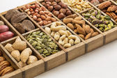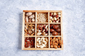 Pecans, orzechy laskowe, migdały, orzeszki sosnowe, orzechy brazylijskie, orzechy nerkowca w drewnianym pudełku na niebieskim tle, widok z góry, płaski lay