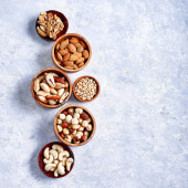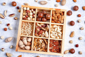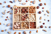 Zdjęcie "Pecans, orzechy laskowe, migdały, orzeszki sosnowe, orzechy brazylijskie, orzechy nerkowca w drewnianym pudełku na niebieskim tle, widok z góry, płaski lay" może być wykorzystywane do celów osobistych i komercyjnych zgodnie z warunkami zakupionej licencji Royalty-free. Obraz jest dostępny do pobrania w jakości wysokiej rozdzielczości do 5760x3840.