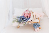 Zdjęcie "piękny wiosenny bukiet delikatnej różowej kwiatów na fotelu, elegancka dekoracja kwiatowa " może być wykorzystywane do celów osobistych i komercyjnych zgodnie z warunkami zakupionej licencji Royalty-free. Obraz jest dostępny do pobrania w jakości wysokiej rozdzielczości do 5760x3840.