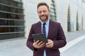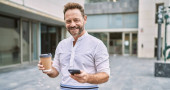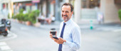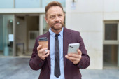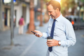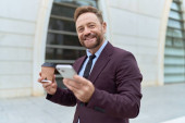 Średni wiek przystojny biznesmen za pomocą smartfona picia zabrać kawę uśmiechnięty