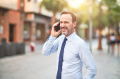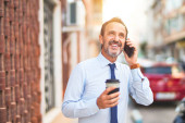 Zdjęcie "Średni wiek przystojny biznesmen za pomocą smartfona picia zabrać kawę uśmiechnięty" może być wykorzystywane do celów osobistych i komercyjnych zgodnie z warunkami zakupionej licencji Royalty-free. Obraz jest dostępny do pobrania w jakości wysokiej rozdzielczości do 5760x3840.