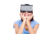 kobieta zakrywa oczy trzymając smartfona z pustym ekranem izolowanym na białym
