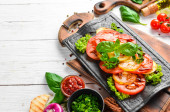 Zdjęcie "Świeże warzywa na talerzu. Posiłki w restauracji. Widok z góry. Wolne miejsce na tekst." może być wykorzystywane do celów osobistych i komercyjnych zgodnie z warunkami zakupionej licencji Royalty-free. Obraz jest dostępny do pobrania w jakości wysokiej rozdzielczości do 5760x3840.