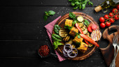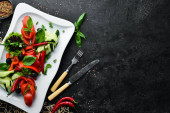 Świeże warzywa na talerzu. Posiłki w restauracji. Widok z góry. Wolne miejsce na tekst.