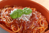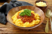 zbliżenie miski z żółtym puree ziemniaczane, czerwony sos i zielone liście bazylii