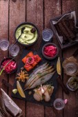 Śledzia walcowane w occie, podawane z cebulą i pikle.