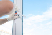 Odkurzacz Robot czyszczący okno w wysokiej budynku na zewnątrz.
