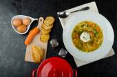 Danie ze świeżych domowych zupa warzywna podawane na jasnym szarym stole, płaski lay