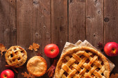 Domowej roboty jesienny jabłko ciasto granica narożna. Scena z widokiem z góry na rustykalne drewno tło z kopią przestrzeni.