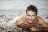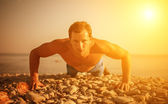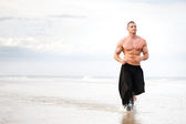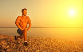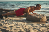 pociągi lekkoatletka mężczyzna pchnął na charakter na plaży