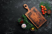 składniki do zdrowego gotowania na tle rustykalnym, widok z góry, banner. Wolne miejsce na tekst.