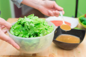 Zdjęcie "Młoda kobieta jeść sałatkę z pałeczkami na niebieskim tle, przestrzeń " może być wykorzystywane do celów osobistych i komercyjnych zgodnie z warunkami zakupionej licencji Royalty-free. Obraz jest dostępny do pobrania w jakości wysokiej rozdzielczości do 5760x3840.