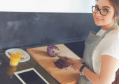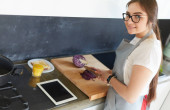 Młoda kobieta używa tabletu do gotowania w kuchni