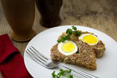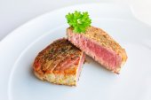 pieczone stek z tuńczyka w sezamie z pietruszką dekorować na talerzu na białym stole