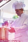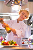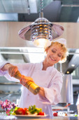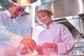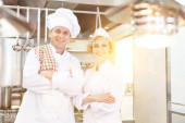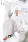 Dojrzali kucharze omawiający składniki stojąc w restauracji kuchennej