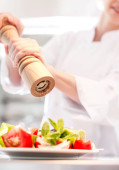 Dojrzały szef kuchni przy użyciu Peppermill na sałatce w talerzu w restauracji