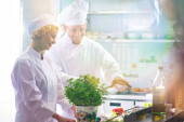 Dojrzały szef kuchni organizujący świeże placki truskawkowe w restauracji