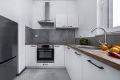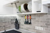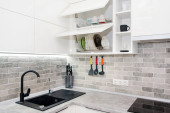 Zdjęcie "Nowoczesne białe wnętrze kuchni. Współczesne wnętrze z elementami poddasza" może być wykorzystywane do celów osobistych i komercyjnych zgodnie z warunkami zakupionej licencji Royalty-free. Obraz jest dostępny do pobrania w jakości wysokiej rozdzielczości do 5760x3840.