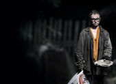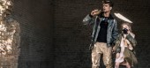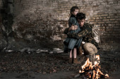 panoramiczne ujęcie przystojnego mężczyzny przytulającego dziecko przy murze z cegły, postapokaliptyczna koncepcja