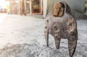 panoramiczne ujęcie starej i strasznej lalki na ziemi, postapokaliptyczna koncepcja