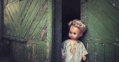 widok z góry brudne i straszne dziecko lalka na ziemi, post apokaliptyczne pojęcie