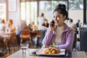 szczęśliwa kobieta rozmawia na smartfonie w barze sushi