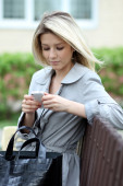 Młoda kobieta czytająca wiadomość przez telefon
