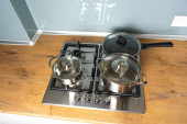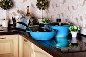 Kuchenka elektryczna. Patelnia jest umieszczona na nowoczesnym piecu elektrycznym,
