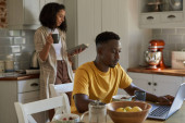 Zdjęcie "Młoda African American para siedzi razem przy stole w domu o śniadanie i kawę w godzinach porannych" może być wykorzystywane do celów osobistych i komercyjnych zgodnie z warunkami zakupionej licencji Royalty-free. Obraz jest dostępny do pobrania w jakości wysokiej rozdzielczości do 5760x3840.