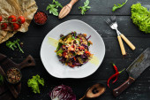 Zdjęcie "Sałatka z pomidorami, cebulą, oliwkami, serem feta. Żywności. Widok z góry. Wolne miejsce na tekst." może być wykorzystywane do celów osobistych i komercyjnych zgodnie z warunkami zakupionej licencji Royalty-free. Obraz jest dostępny do pobrania w jakości wysokiej rozdzielczości do 5760x3840.