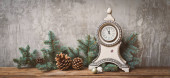 bukiet gałęzi jodłowych w czerwonym Cup i zabawki świąteczne na konkretnym tle.