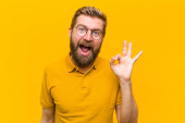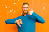 Zdjęcie "młody blondynka człowiek uśmiecha się szeroko wygląda szczęśliwy, pozytywny, pewny siebie i sukces, z obu kciuki do góry o pomarańczowy ściany" może być wykorzystywane do celów osobistych i komercyjnych zgodnie z warunkami zakupionej licencji Royalty-free. Obraz jest dostępny do pobrania w jakości wysokiej rozdzielczości do 5760x3840.
