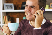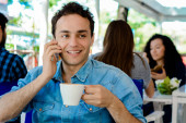 Zdjęcie "młody biznesmen, picia kawy i mówiąc na telefon" może być wykorzystywane do celów osobistych i komercyjnych zgodnie z warunkami zakupionej licencji Royalty-free. Obraz jest dostępny do pobrania w jakości wysokiej rozdzielczości do 5760x3840.